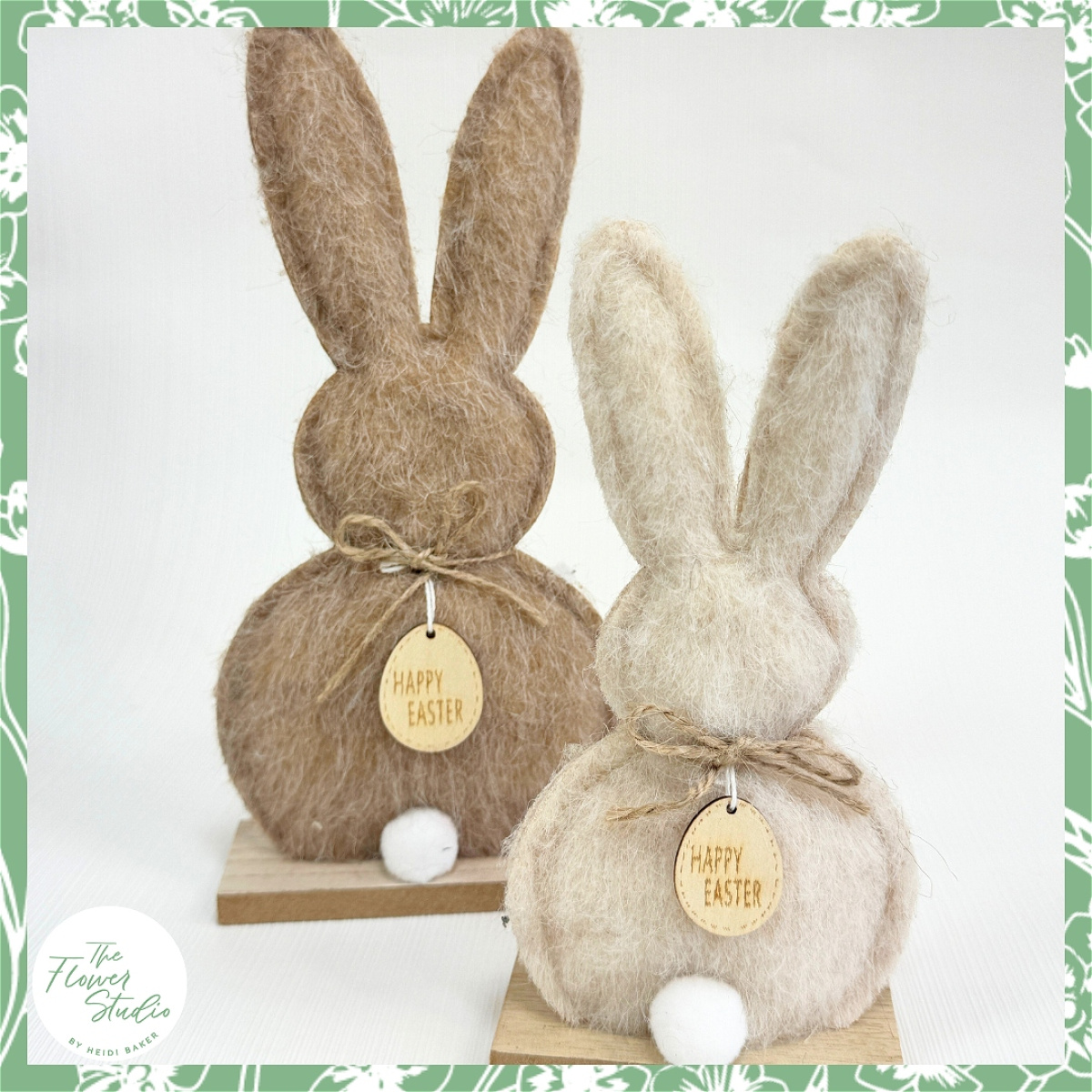 A chic fluffy bunny decoration - beautifully stitched with a jute string bow, wooden 'Happy Easter' tag and fluffy pom pom tail, mounted on a wooden base